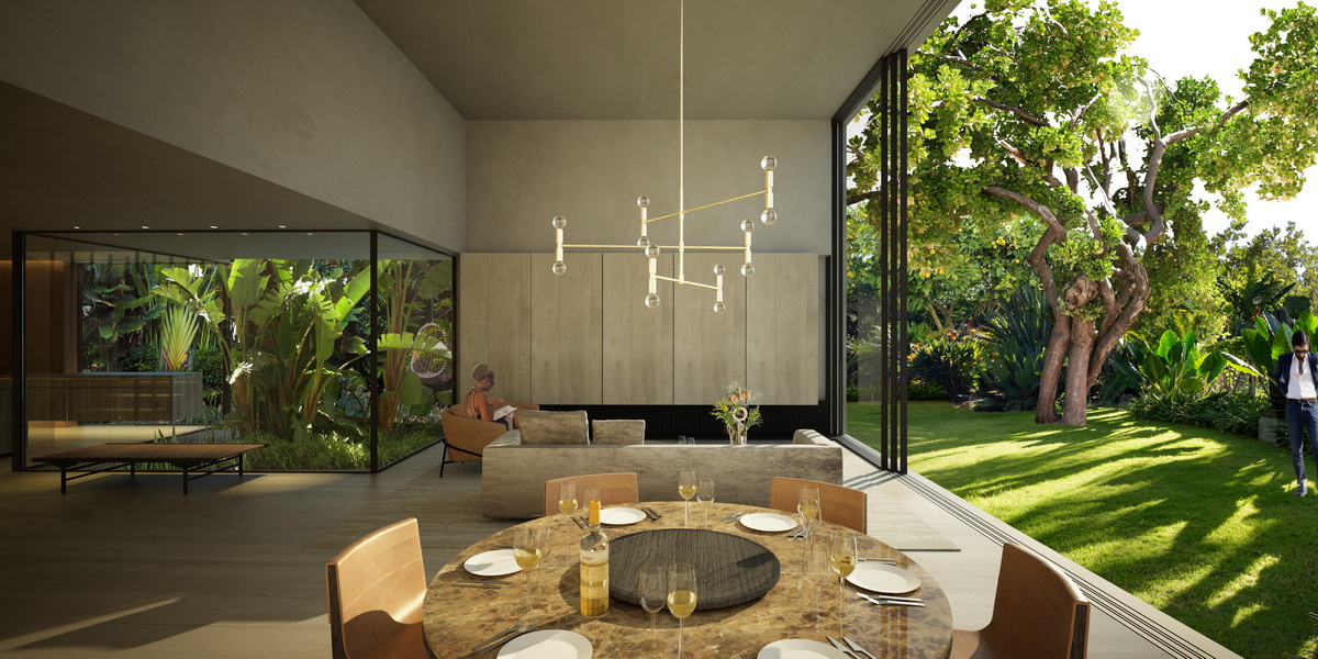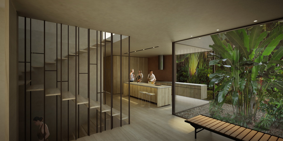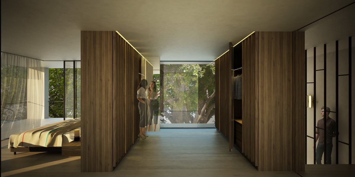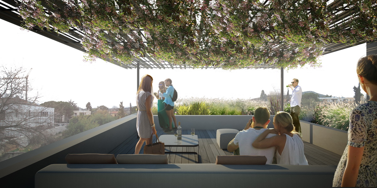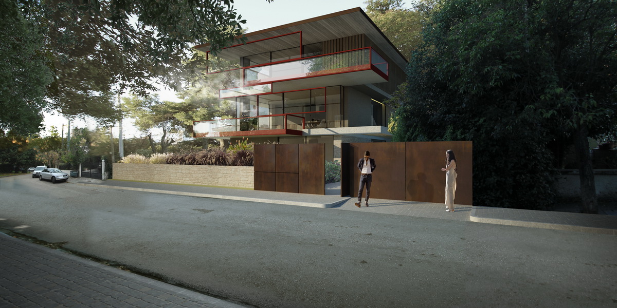 The owners’ goal for this three-story building was a lightweight architecture of thin profiles, instead of a prevalent approach that interprets modernism as a set of monolithic gray volumes with smaller openings. At the same time we would like to retain for these triplex apartments the impression of a single residence, so the motif of repetitive balconies should be avoided. Our proposal is to use glass partitions so as to unify balconies of slim profiles and dynamic placement -a reference both to Takis Zenetos’ graceful apartment buildings and Richard Neutra’s Case Study Houses. The experience of a single residence is pursued by the incorporation of a double height planted patio on the ground floor (seeking to merge the garden with the building in Filothei, a suburb that is particularly distinguished by its gardens) but also with the formation of a double height living area, capable of maximizing the view of the trees of the garden.