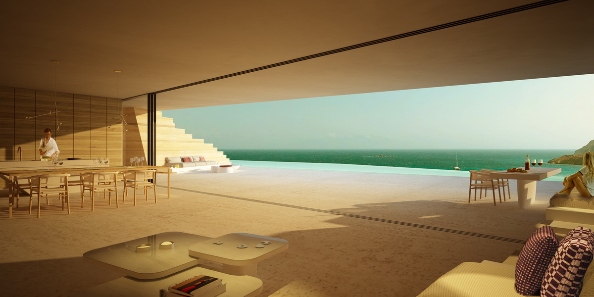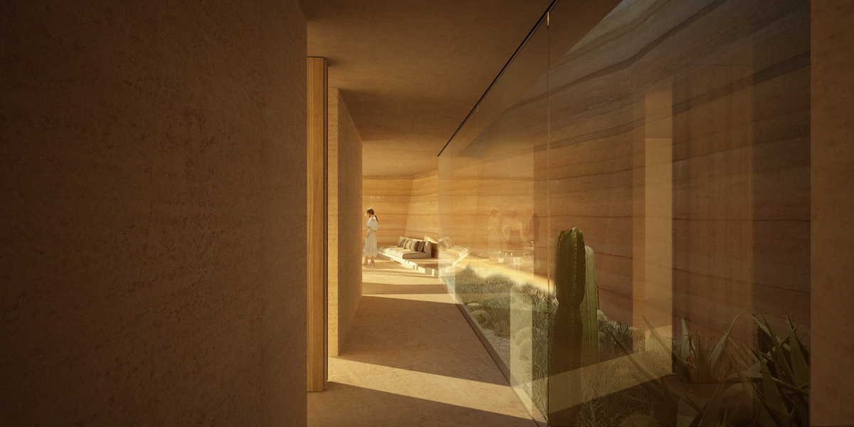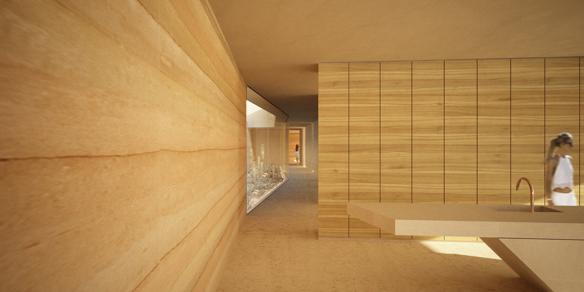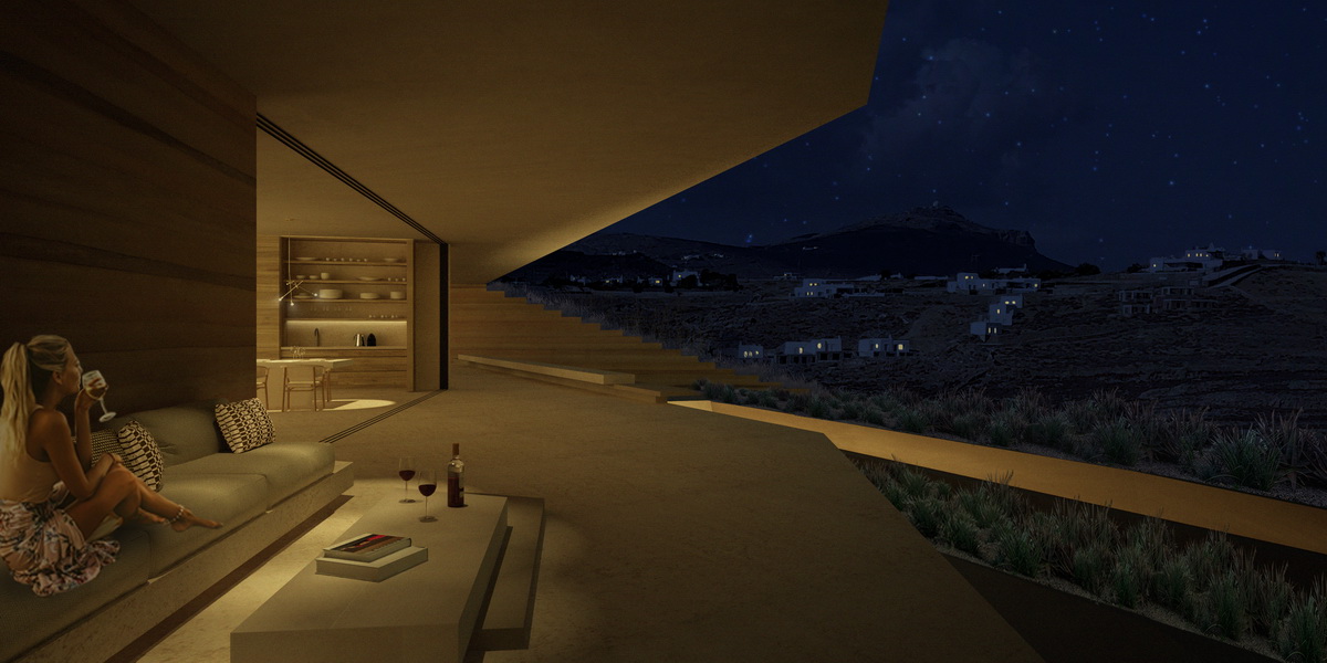 A new typology for Greek architecture has recently been approved within the national building legislation: as long as it features only one façade, merged with the ground, this subterranean type harking back to Santorini’s caved traditional architecture, became more attractive as it doubled the allowed surface of a residence in comparison to the traditional free standing typology. And from a modernist viewpoint, this new typology seems to lead to a flat glass façade recessed in the slope, embedding the orthogonal regularity of a glass villa. We instead proposed a hybrid: a glass façade that folds and refracts the natural relief of a slope. If this merging of architecture and earth sounds conceptual, it becomes literal with the overpowering section of ground stabilized behind the pool, a remnant of rock that seems preserved intact. Equally untouched is a land zone between the two residences that are each placed at a different level in the downhill plot, securing privacy in their courtyards. A slit in the ground forms an outdoor staircase that connects these two houses. Small instances of light are scattered in the houses, voids demarcating the ceilings. The two linear slots in the corridors leading to bedroom areas signify the transition to the more private zones of the house and encased in glass become outdoor plantation zones. The references remain geological: the fragment of the intact slope marking the facade resembles the topography of a beach interrupted by large rocks and the permeating light descending from skylights gives the feeling of a cave.